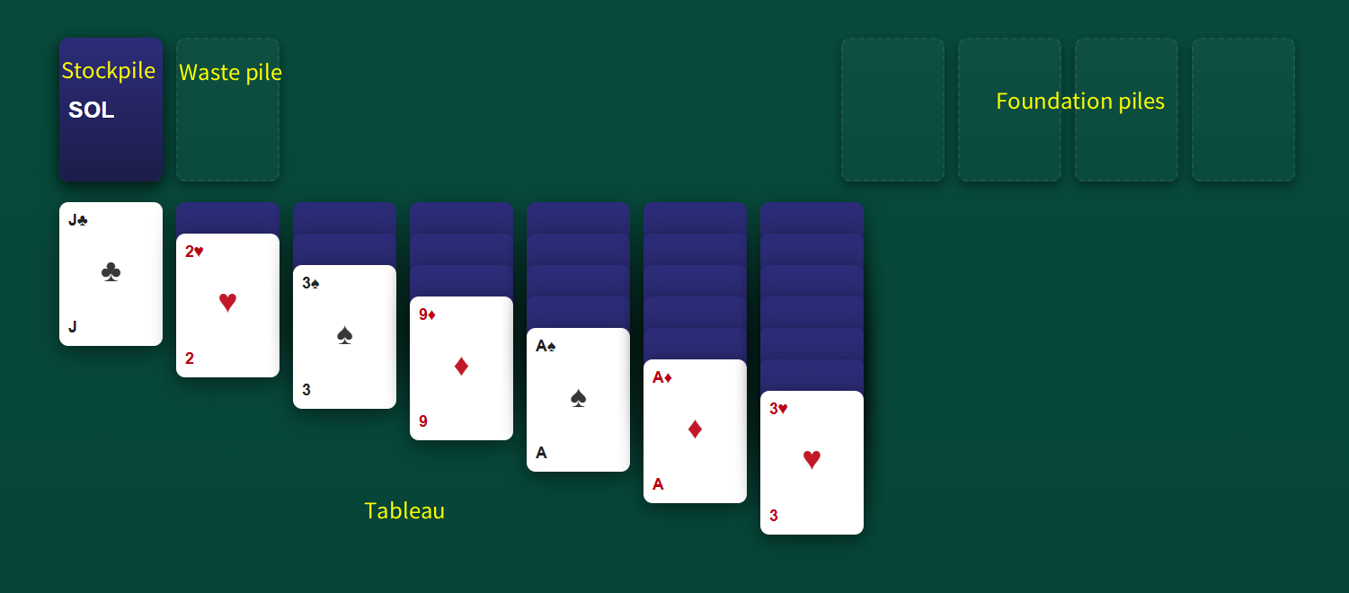 Tableau: The tableau is where you sequence face-up cards and uncover facedown cards. It consists of 28 cards spread across seven columns. Each column has the same number of cards as its column number (for example, the third column has three cards) with the last card in each column flipped face up.